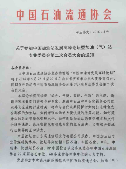 中国石油流通协会将于2016年5月25日至27日在山东省济南市山东大厦隆重召开首届“中国加油站发展高峰论坛”,同期召开的还有中国石油流通协会加油(气)站专业委员会第二次会员大会,现就有关事项通知如下,请各有意参加的会员单位将参会人员名单于2016年5月23日前报省石油成品油流通行业协会邮箱。