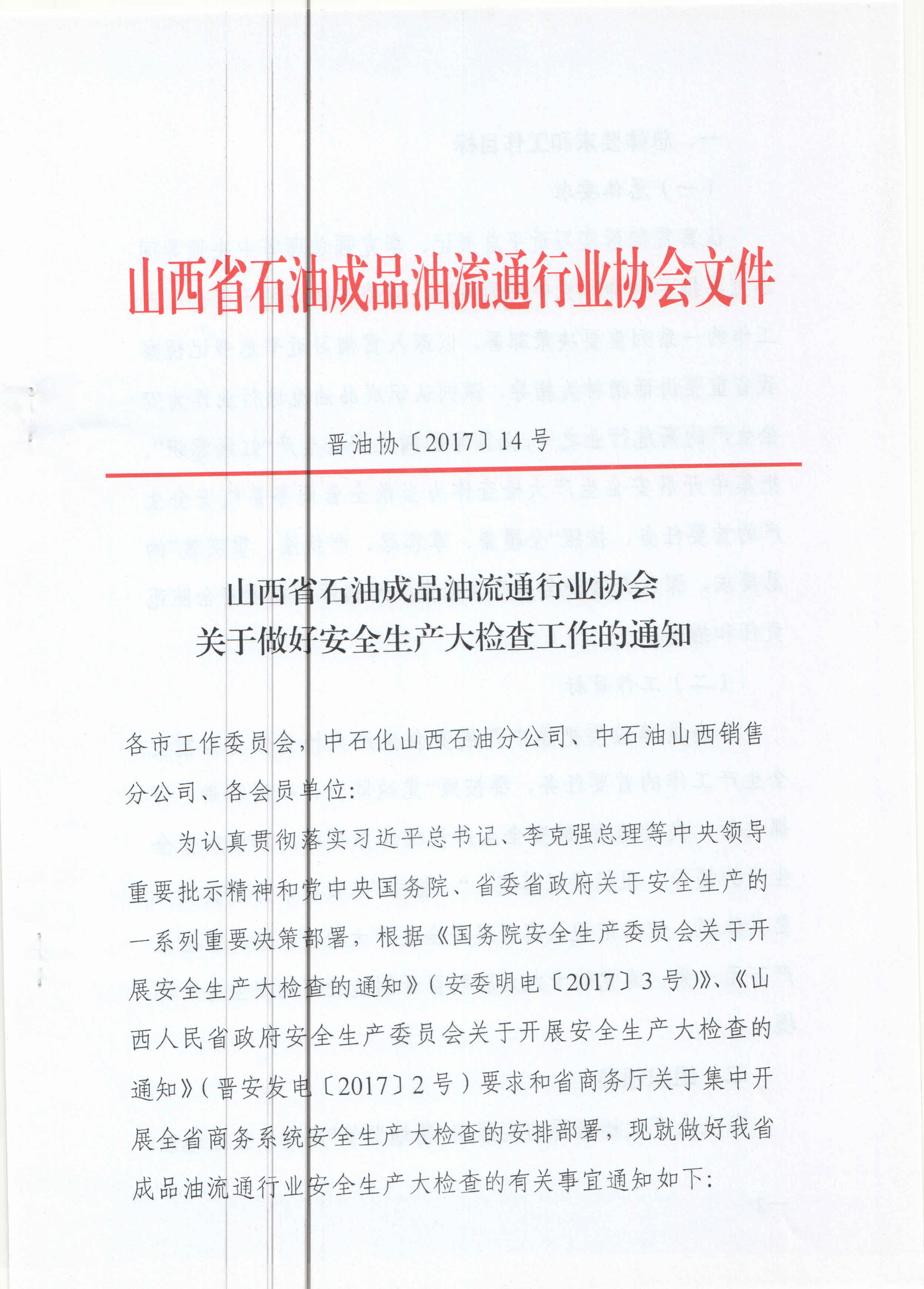 为认真贯彻落实习近平总书记、李克强总理等中央领导重要批示精神和党中央国务院、省委省政府关于安全生产的一系列重要决策部署,根据《国务院安全生产委员会关于开展安全生产大检查的通知》(安委明电〔2017〕3号)》、《山西人民省政府安全生产委员会关于开展安全生产大检查的通知》(晋安发电〔2017〕2号)要求和省商务厅关于集中开展全省商务系统安全生产大检查的安排部署,现就做好我省成品油流通行业安全生产大检查的有关事宜通知如下: