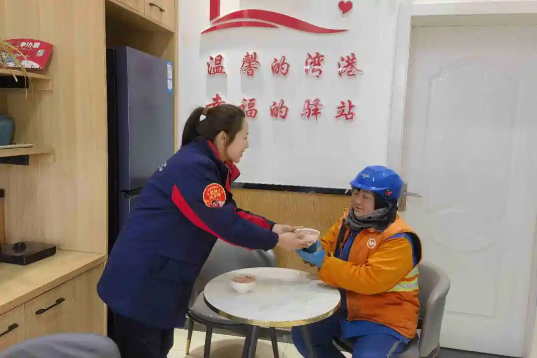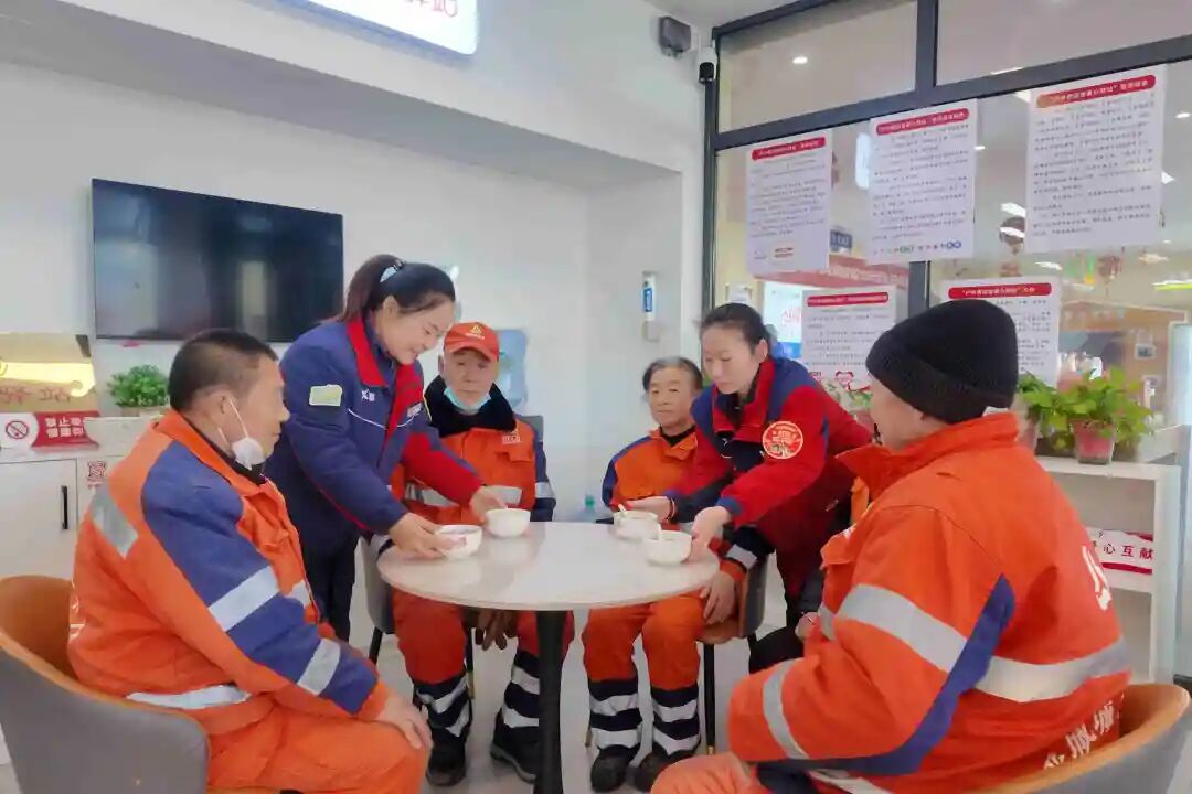 环卫工人师傅们忙完路段清扫,陆续来到驿站。工作人员赶紧把熬得软糯香甜的腊八粥盛进碗里,双手递到师傅们手上:“师傅,快趁热喝,暖暖身子!” 师傅们接过热乎的粥,坐在驿站的椅子上慢慢喝着,脸上都露出了笑容。除了腊八粥,驿站里还准备了热水、纸巾,师傅们要是累了,还能在这儿歇会儿、擦擦手。一碗热粥,几句关心,虽然都是小事,却让户外劳动者心里热乎乎的。大家都说,这样的活动特别实在,让人觉得心里暖烘烘的。